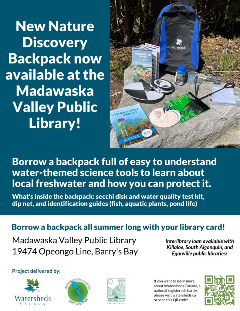 The Nature Discovery Learning Backpacks– In conjunction with Watersheds Canada, these backpacks are intended for lending at the Madawaska Valley Public Library. They align nicely with our current mission to support and promote environmental stewardship. This project offers an exciting opportunity for a hands-on approach to learning for folks of all ages in our community. It is a great way to investigate the great outdoors and gain a deeper appreciation of its importance. Our first discovery backpack was themed for water quality testing.